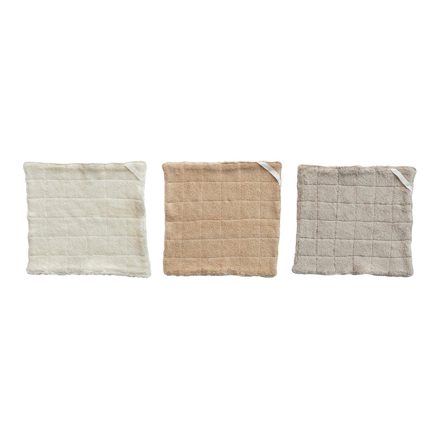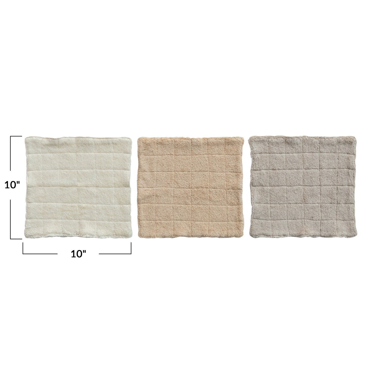 This 10" square hand towel features a quilted cotton terry material, providing a soft and absorbent surface for drying hands. Its neutral color makes it a versatile addition to any bathroom. Enjoy the luxurious feel and practical benefits of this high-quality hand towel.