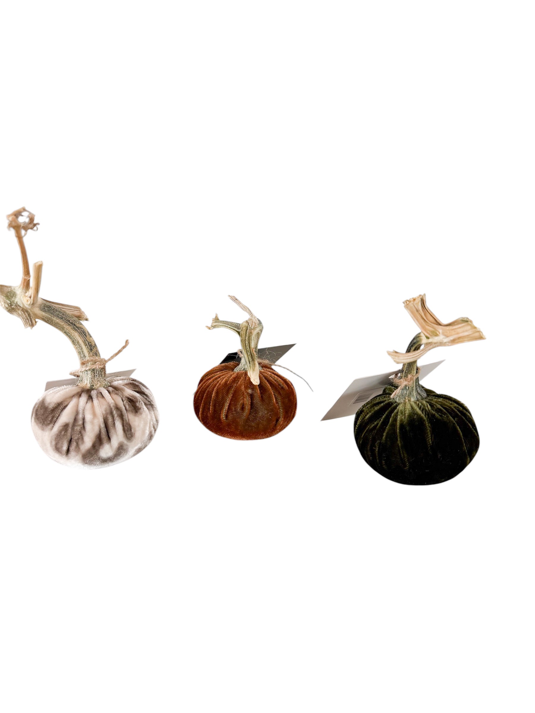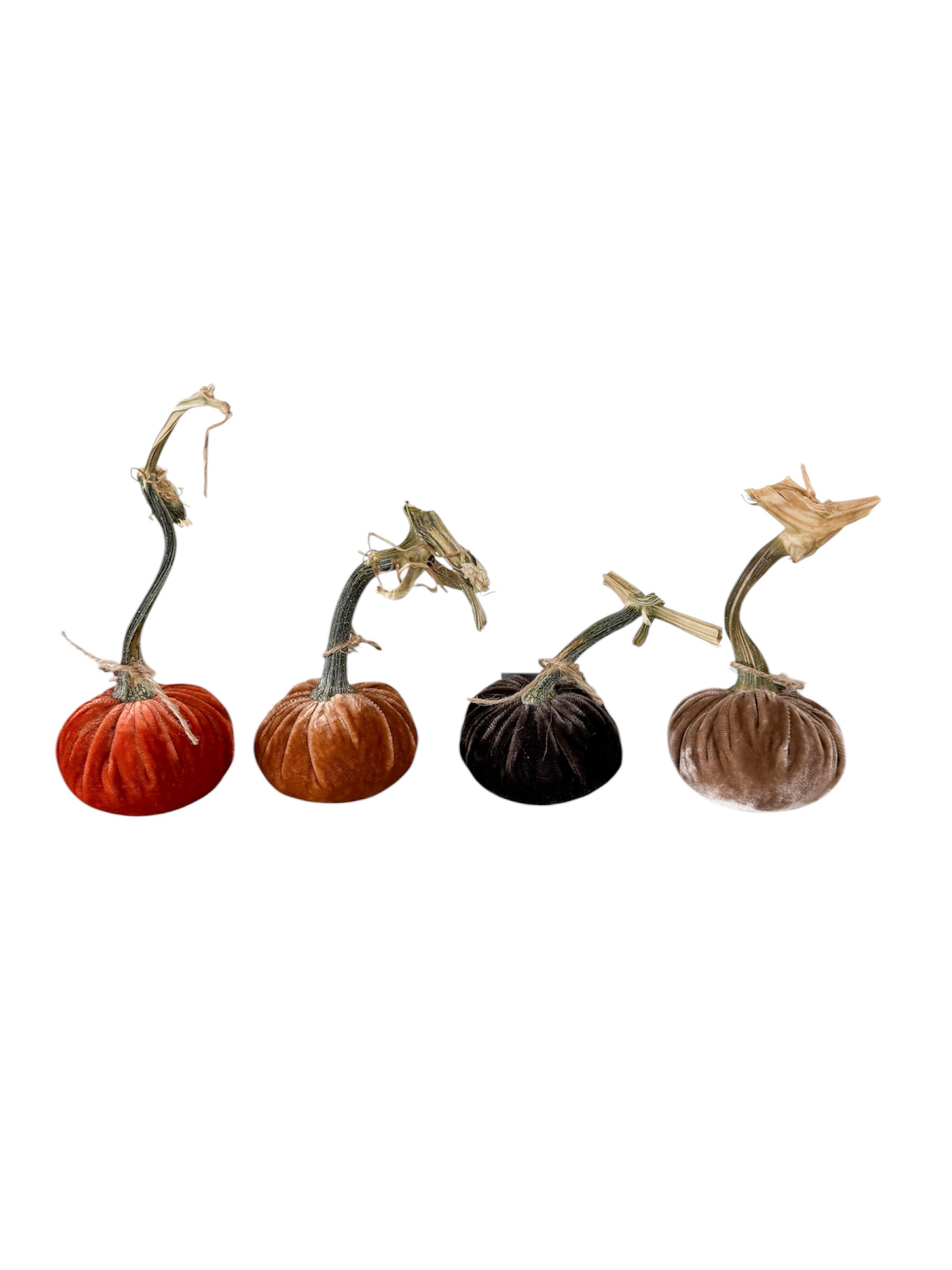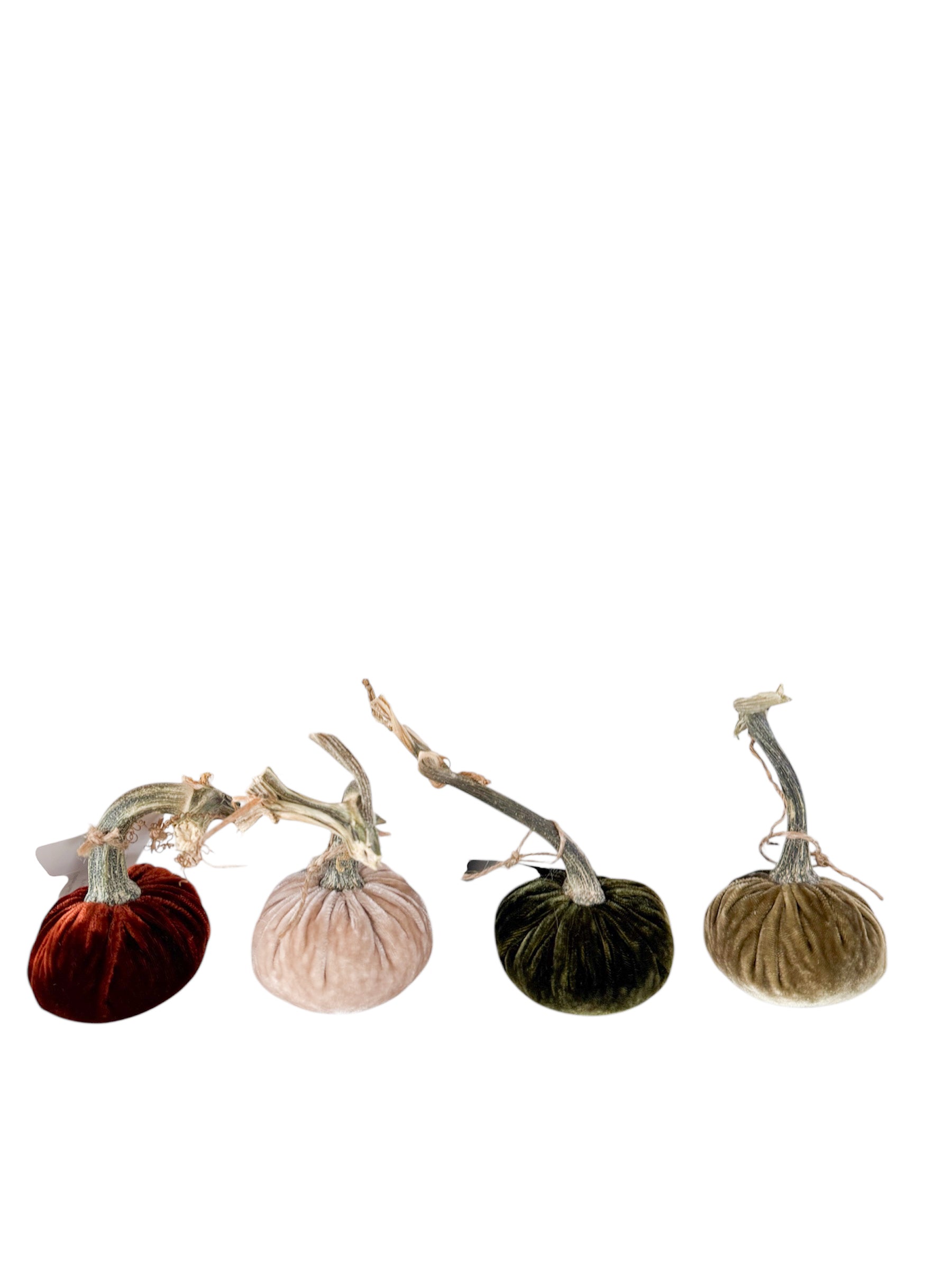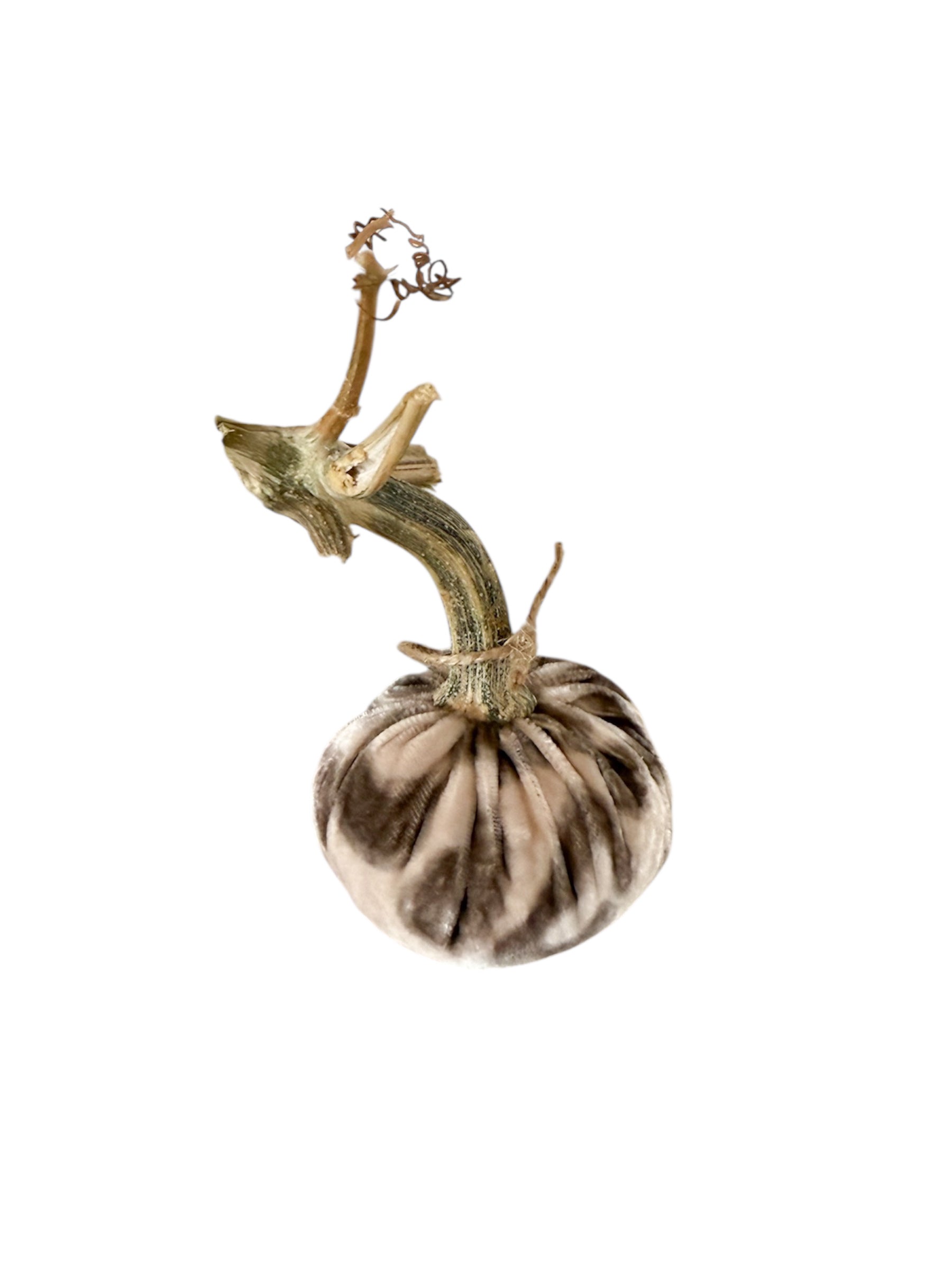 These velvet pumpkins are handmade in Oregon by one of our trained artisans. Each piece is hand cut and sewn to order and finished with a natural stem. Our stems are specially curated varieties to ensure beautiful shapes and quality.