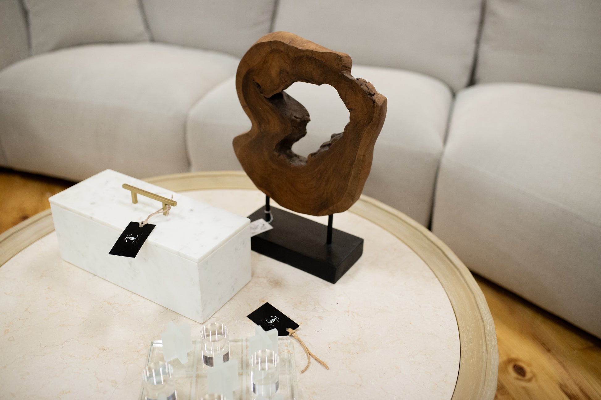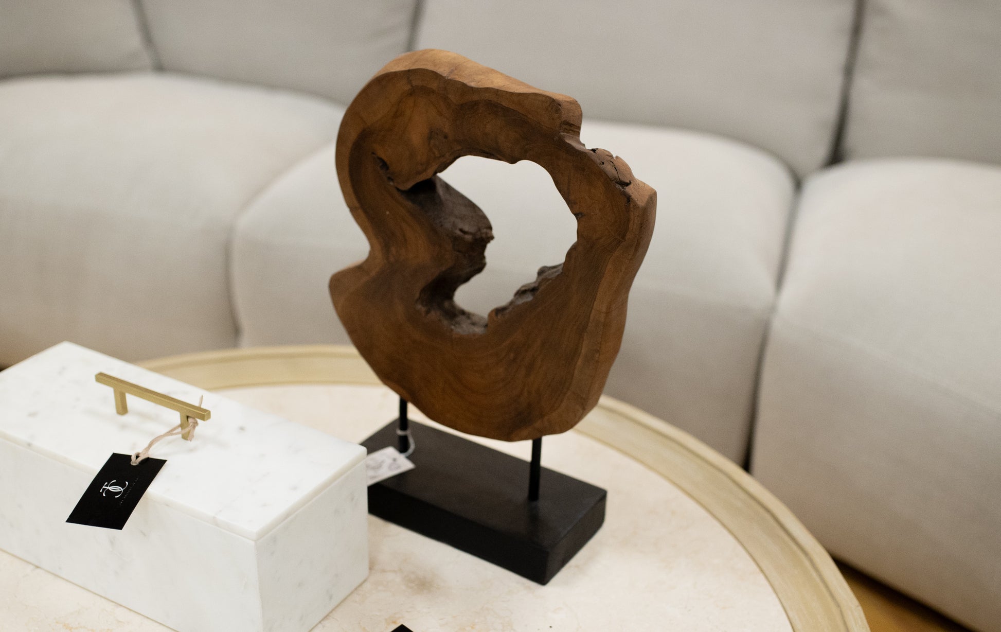 Add a dramatic focal point with the Chambers statuary. With deeply grained cross sections of natural teak wood this piece is a natural fit for any room.