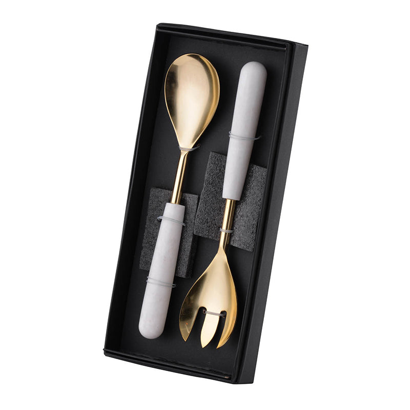 This salad server set brings timeless style to the table. This set would make a fantastic housewarming gift, a gift to a gourmet aficionado, or even a gift to yourself. Both pieces feature stainless steel construction with marble handles.