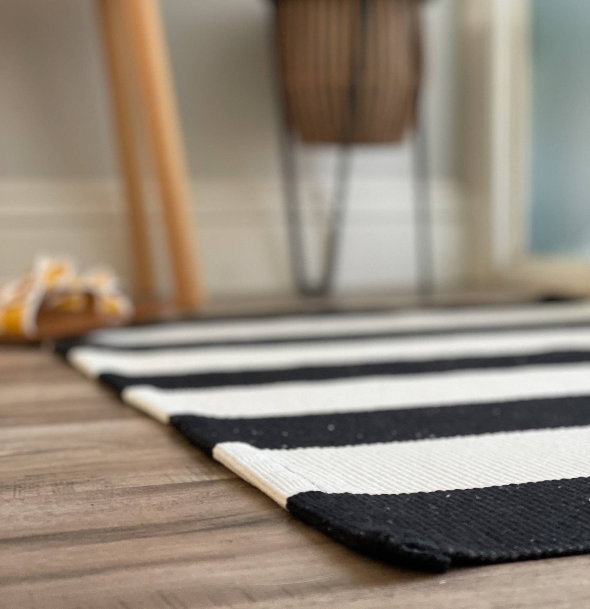 No matter what room you place it in, our Black and White Striped Accent Rug is sure to be a stylish addition with a neutral pattern. Featuring a lovely mixture of black and white vertical stripes, this rug helps to compose the looks of any space inside or out. When layered under a custom Nickel Designs doormat, the look is picture perfect for your home!