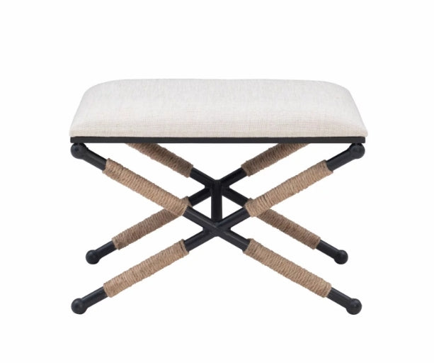 Perfect for a variety of spaces, the Ashburn Campaign Accent Stool has a versatile design that allows it to be used throughout your home. Add to a vanity, hall or end of the bed, the stool provides comfortable seating and transitional style to a space. The black metal legs have rope wrapped details that lend perfectly to the neutral upholstered top.