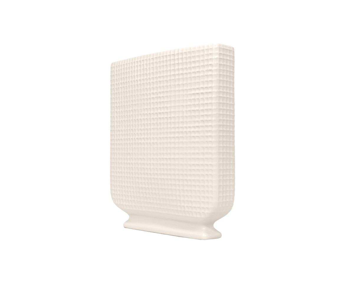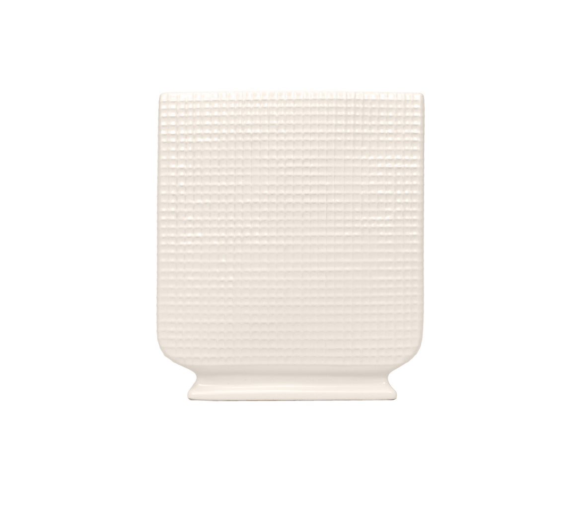 Indulge in the refined elegance of the Leander Tall Vase. Crafted from exquisite stoneware, this thin, narrow vase is adorned with small embossed square pattern, adding a touch of sophistication to any space. The beige color enhances its unique style, while the smooth base provides a luxurious finish. Measuring 14L x 3W x 16H, this vertically rectangular vase is the perfect addition to your home decor. Elevate your surroundings with this simple yet elegant piece.