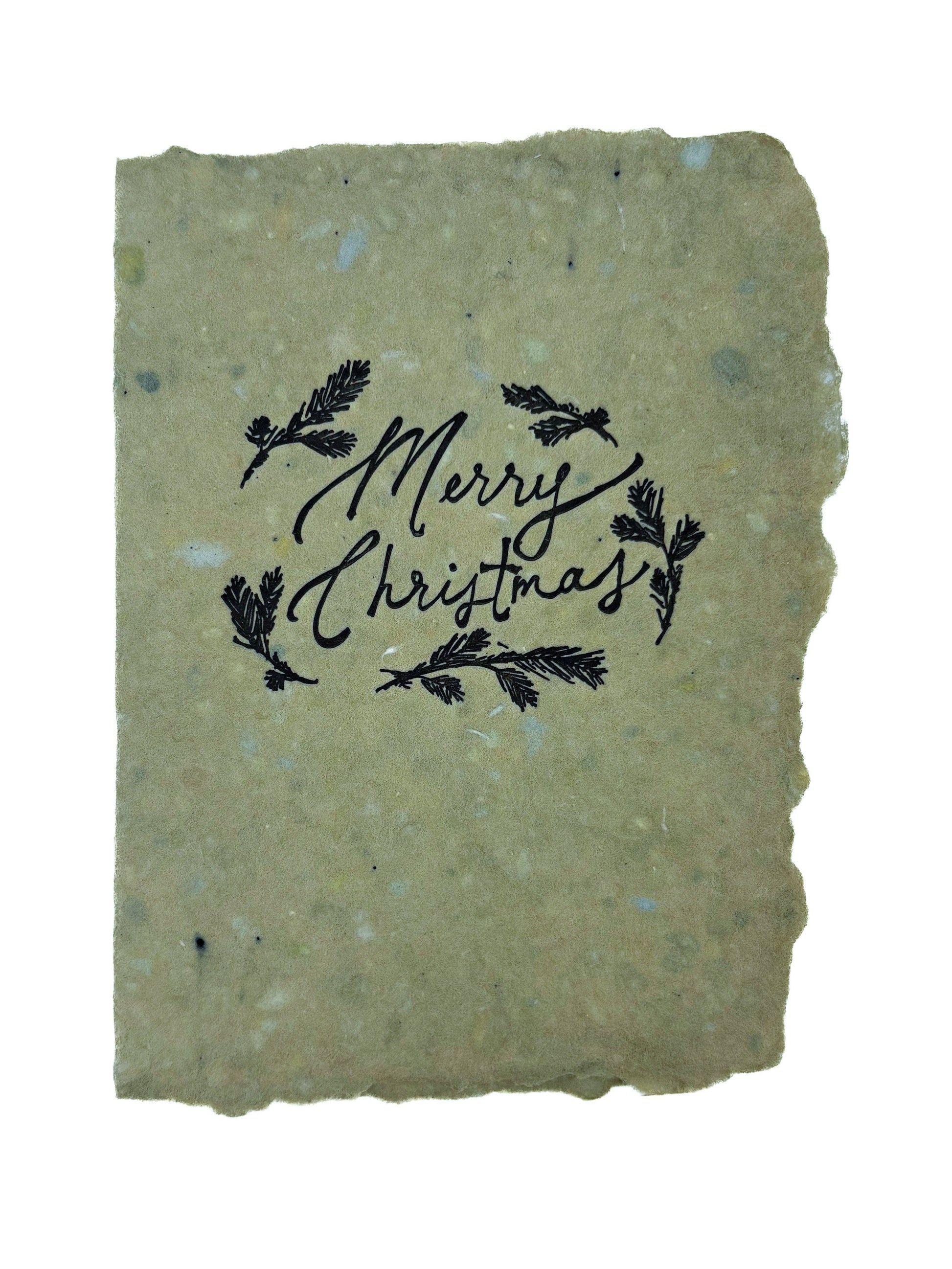 Card reads "Merry Christmas" surrounded by 5 pine branches