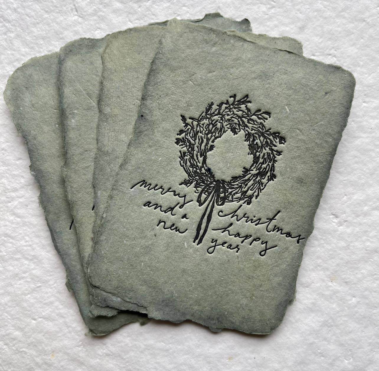 These notecards feature the words “merry christmas and a happy new year” in script handwriting with a wreath illustration - black letterpress on live oak green paper