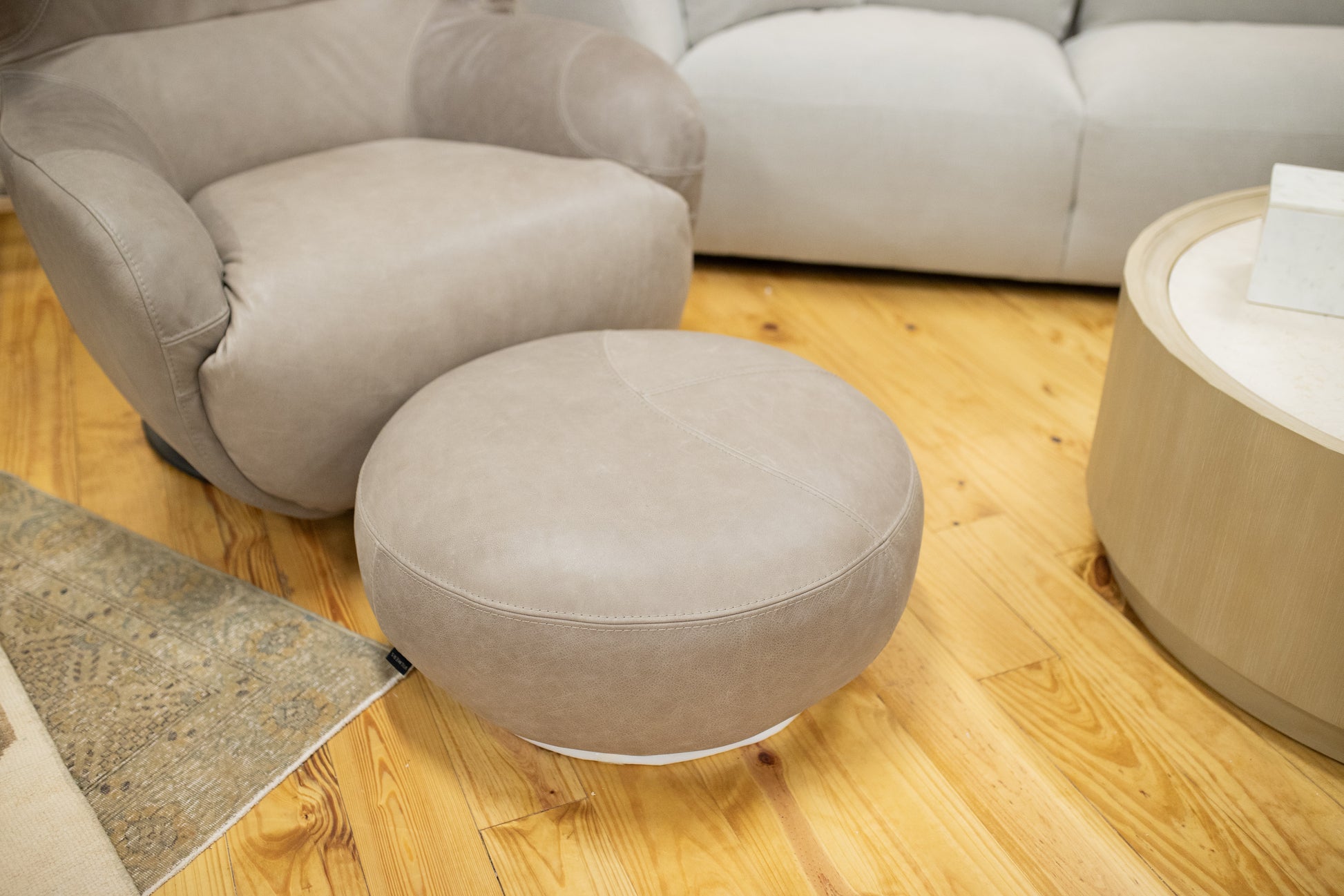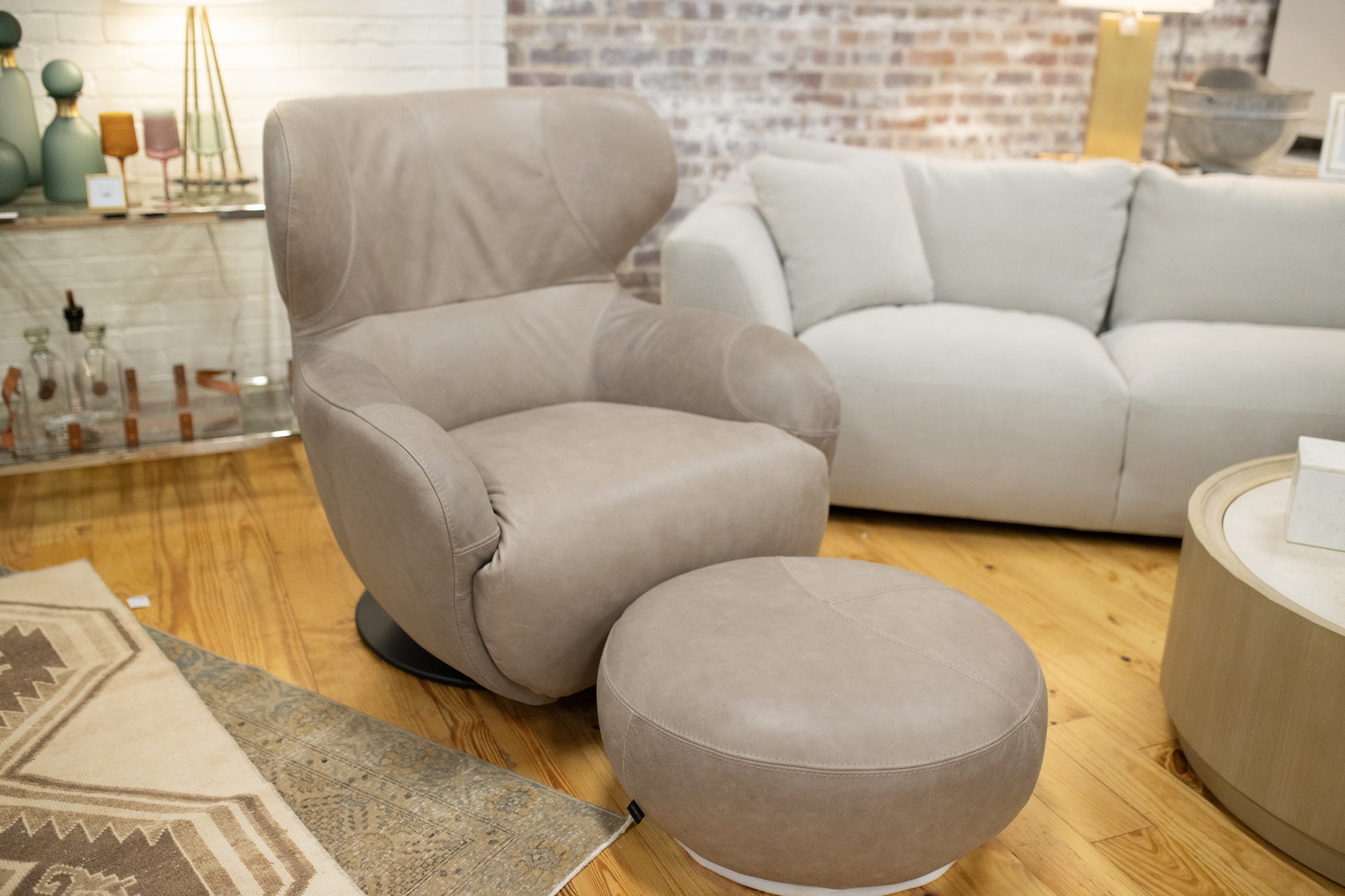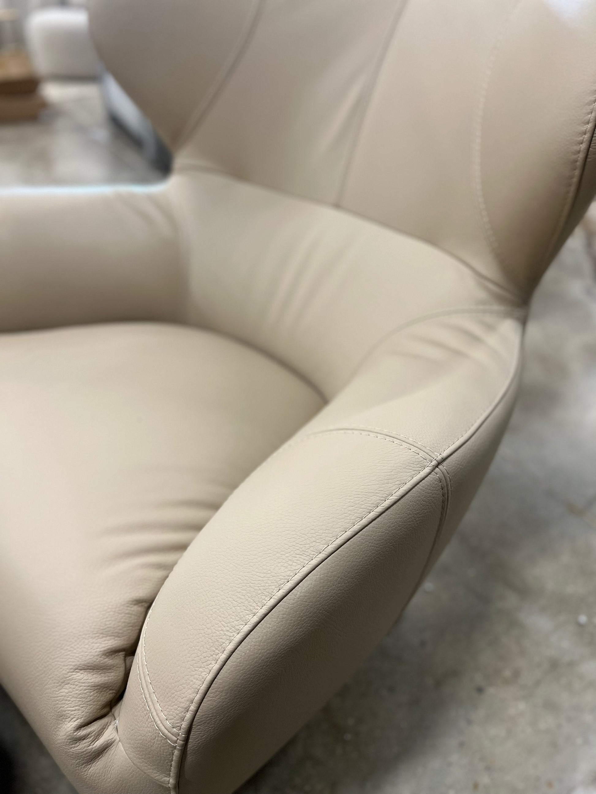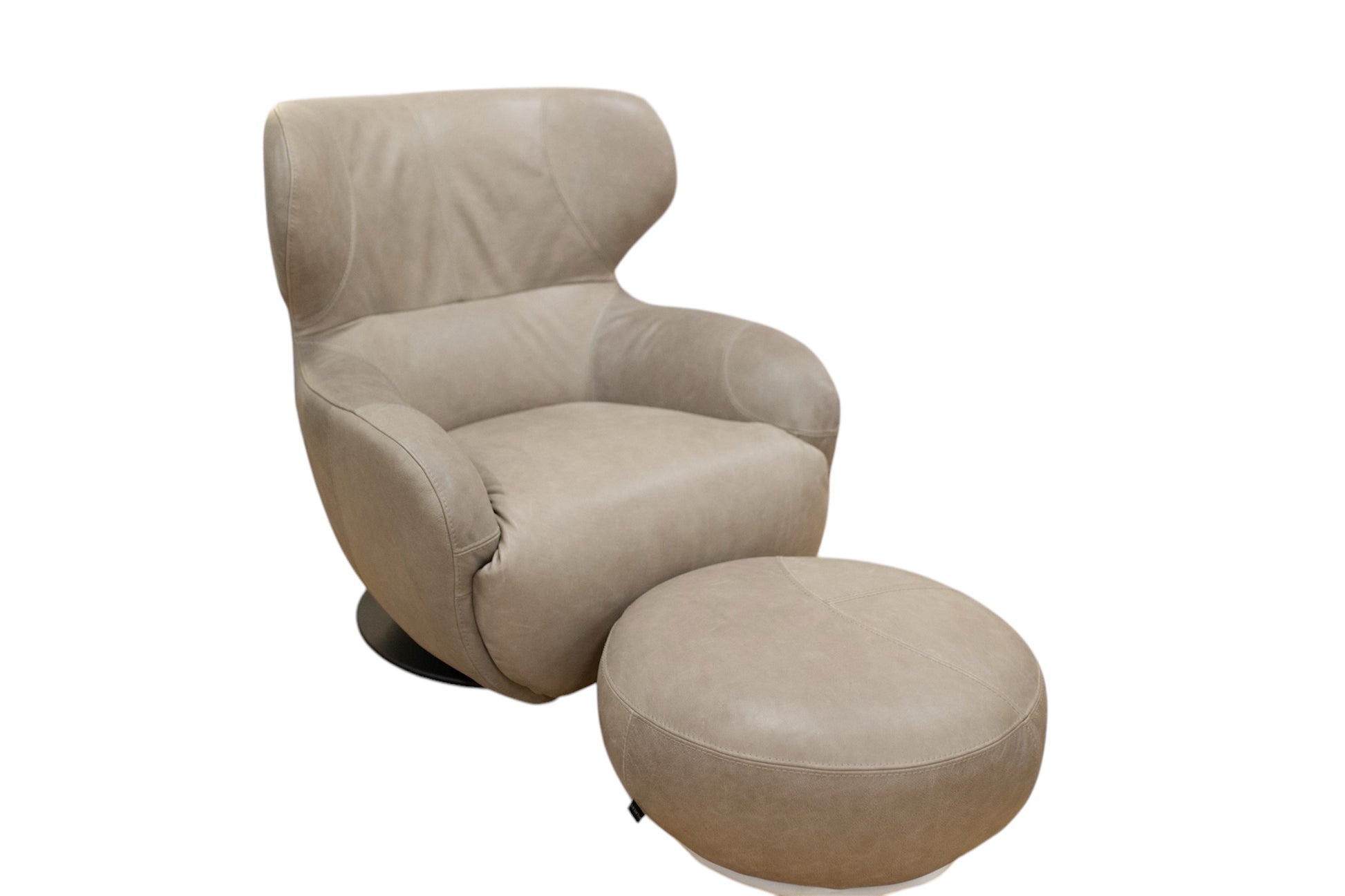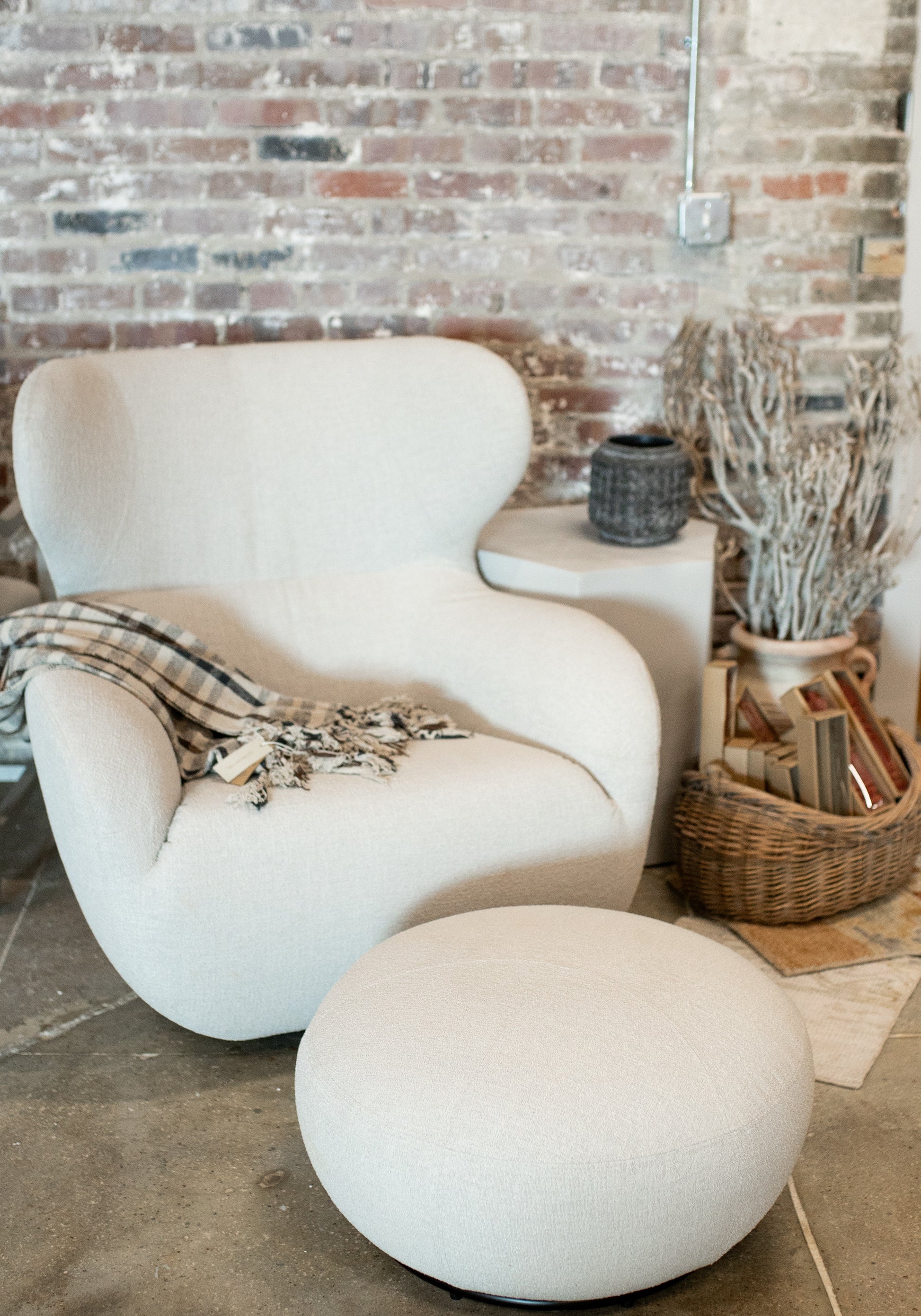 41” H x 36” Depth x 38” W The SHELL chair and footstool is a design and comfort lover's dream. The armchair features curved arm and backrests, a wrap-around headrest, rotation and two options for the base - a round wireframe and a solid looking pad, really adding to its functionality. While the accompanying footstool, like a perfectly rounded and formed beachstone, complements and completes this beautiful set. An exquisite piece/collection with a stunning silhouette.